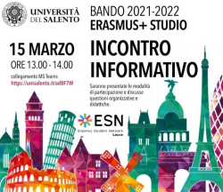 Vi aspettiamo sulla piattaforma Teams, Lunedì 15 marzo alle ore 13.00 per presentarvi l'opportunità Erasmus+ Studio dell' @unisalento.it e successivamente alle ore 16.00 un incontro specifico per studenti di ogni singolo Dipartimento :)